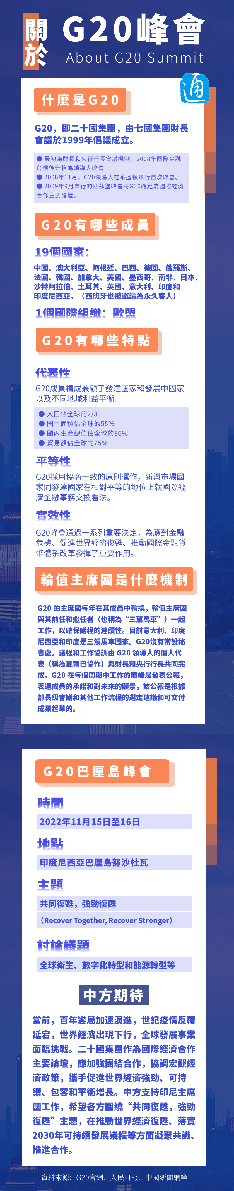 香港新聞網11月13日電 G20領導人第十七次峰會將於11月15日至16日在印尼巴厘島舉行。對於已舉行了16次的G20,你了解多少?G20有哪些成員?這次G20巴厘島峰會吸引了全世界媒體的目光。為什麼這次峰會如此重要?中方對此次G20峰會有何期待?一張圖,梳理G20“乾貨”↓↓