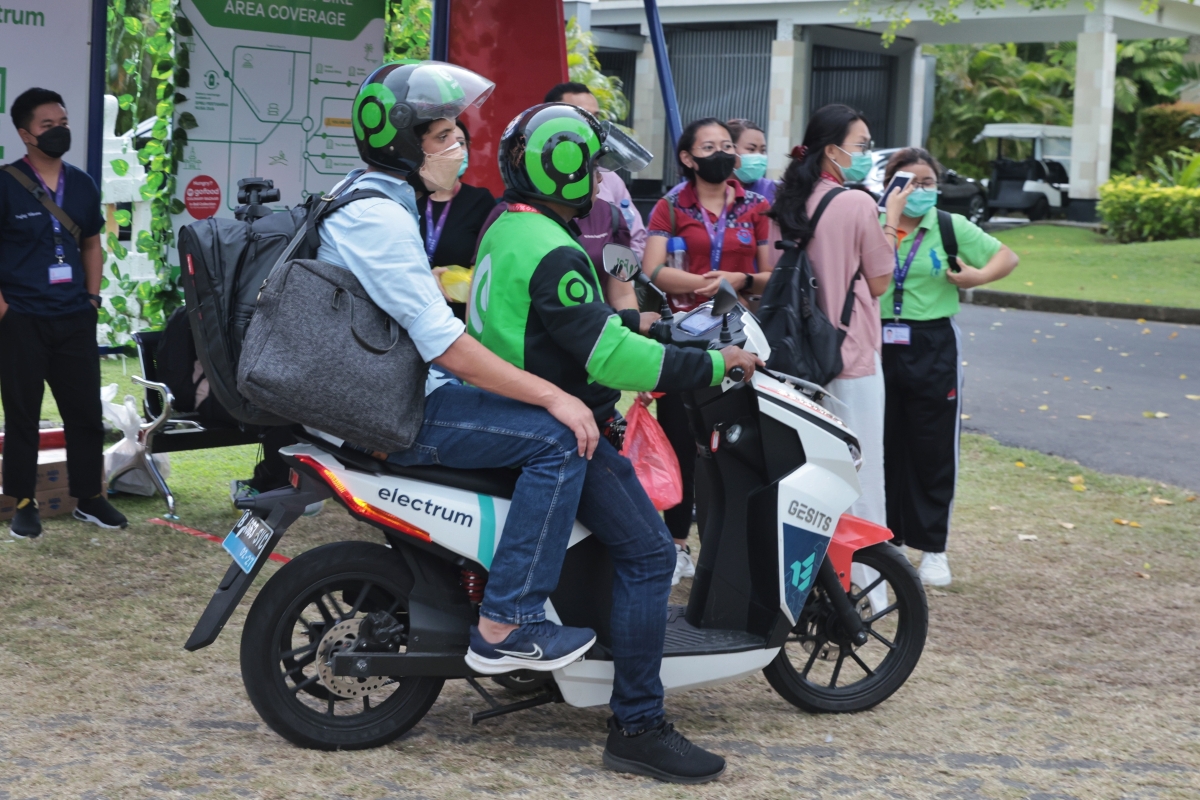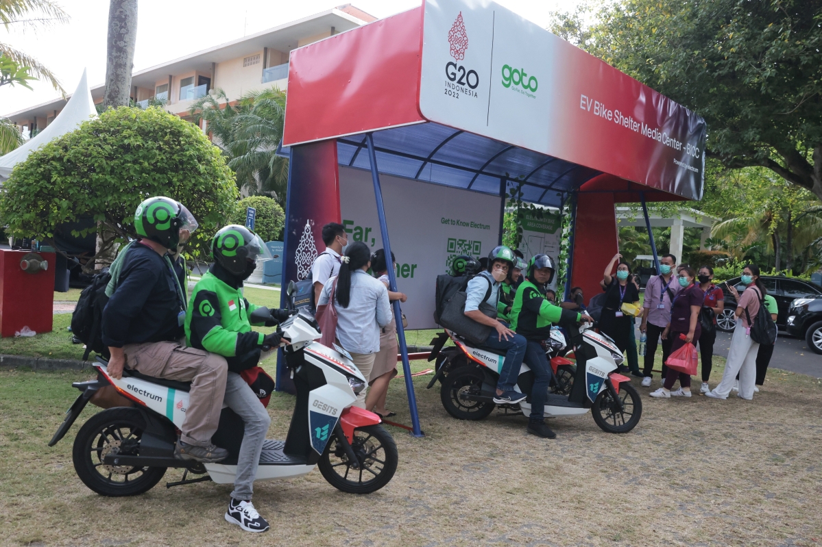 香港新聞網11月15日巴厘島電(記者謝光磊)15日,二十國集團領導人峰會(G20)在印尼巴厘島揭幕。G20峰會管制區只限已註冊車輛進入,主辦方除了提供接駁車服務外,為方便記者採訪,特別安排了電動摩托車接駁,靈活穿梭於媒體中心和不同會場間,許多媒體對乘坐摩托車在會場穿梭感到新鮮,也有摩托車司機對於能參與到國際會議感到開心。