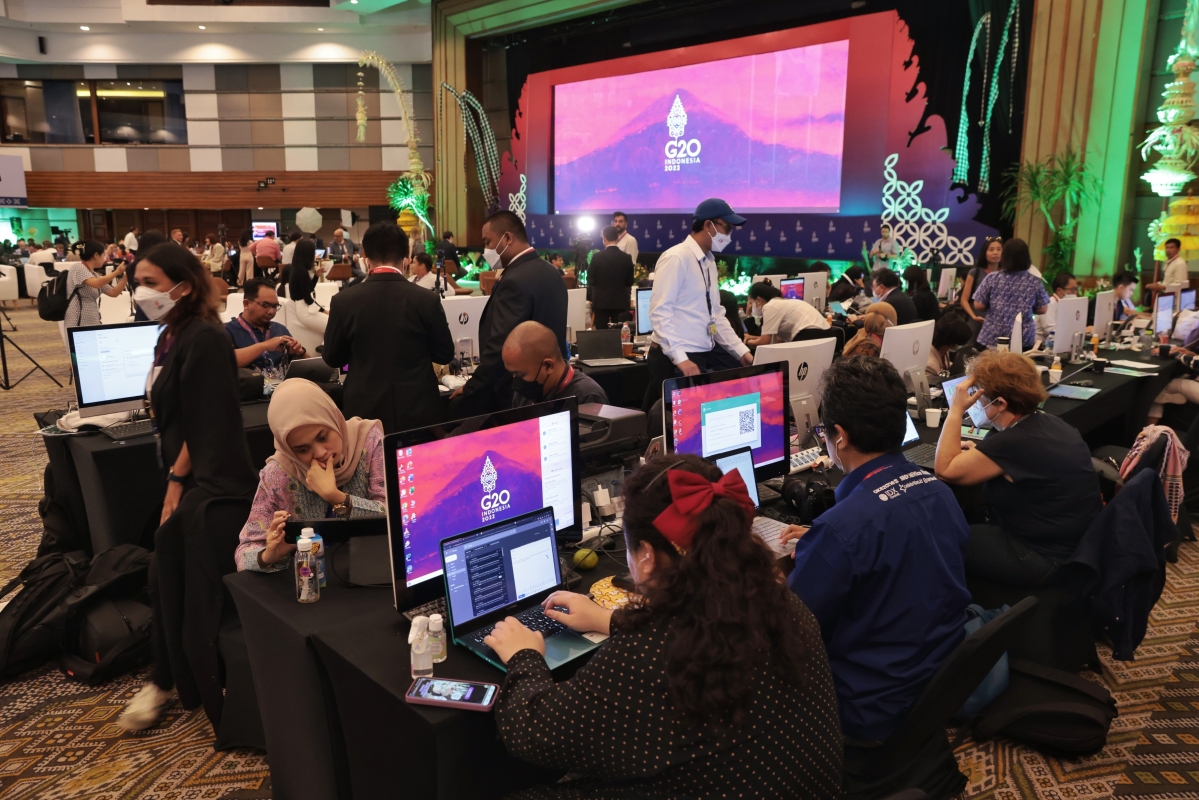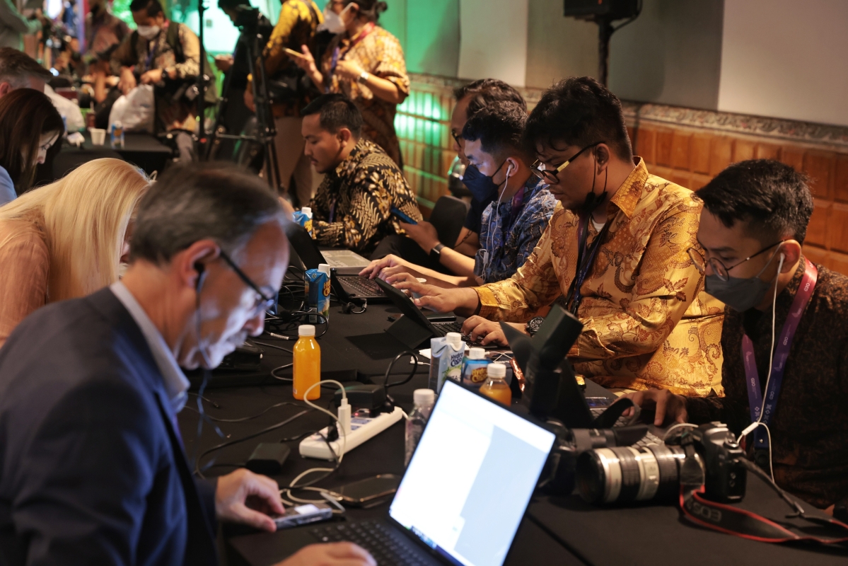 身穿印尼傳統服飾的記者在媒體中心關注峰會。 【編輯:洪少葵】