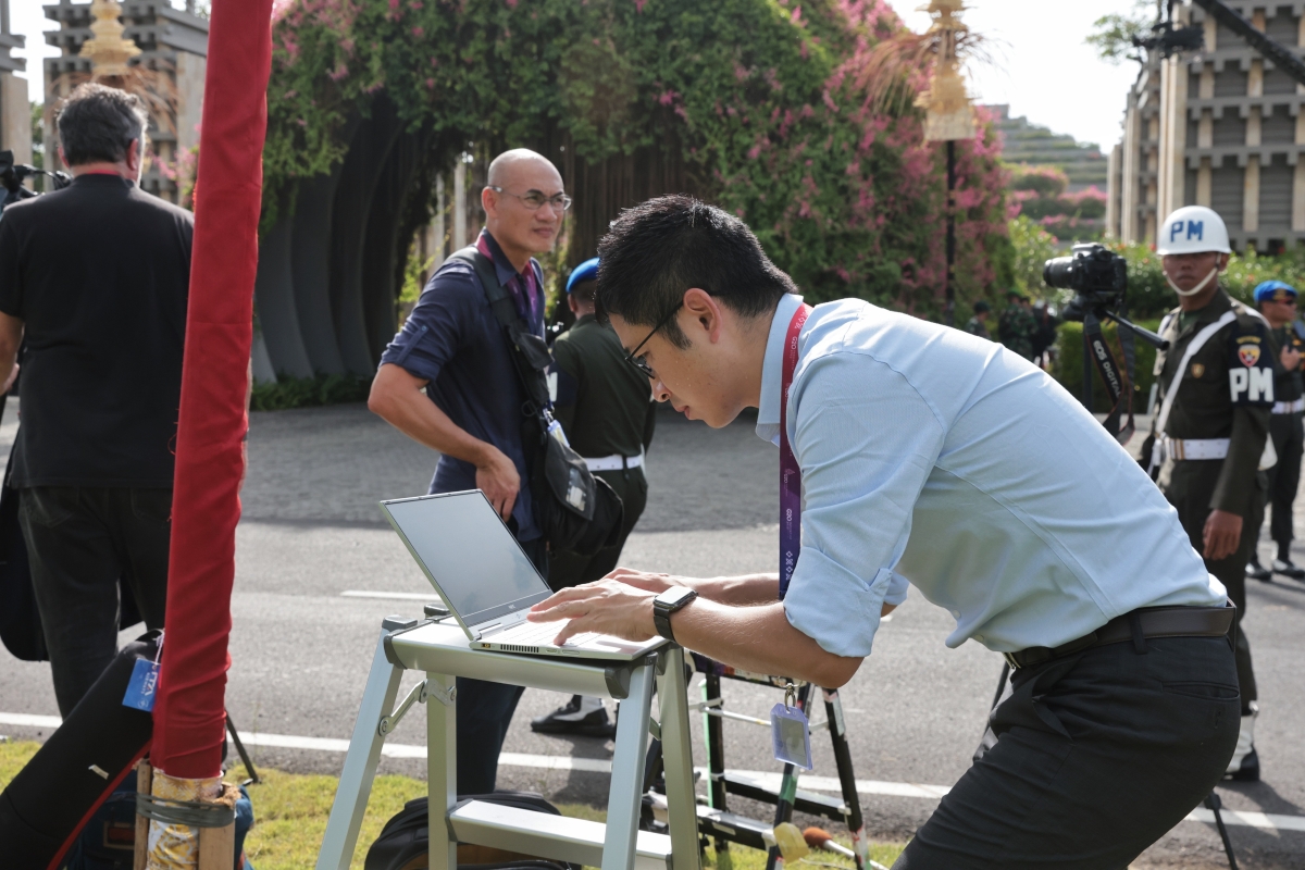 主會場外聚集了許多來自世界各地的記者,有記者用梯子做桌子現場發稿,當日巴厘島氣溫約30度,記者臉上汗珠清晰可見。