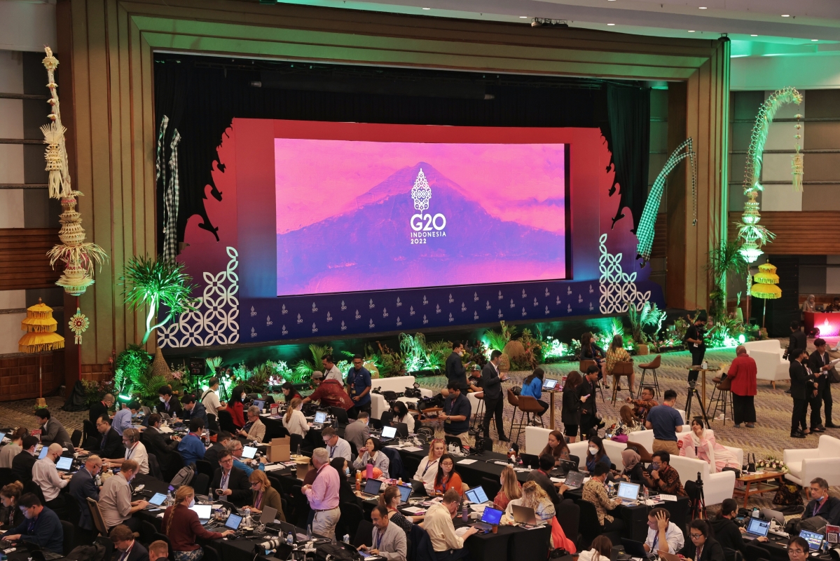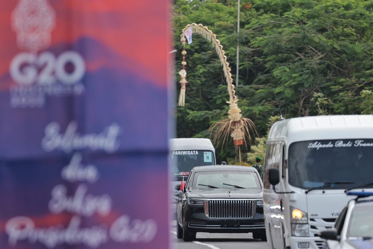 在印度尼西亞巴厘島,蓬葭(一種由竹竿撐起的高挑裝飾物)裝飾道路兩側,向出席G20峰會的賓客表示歡迎。
