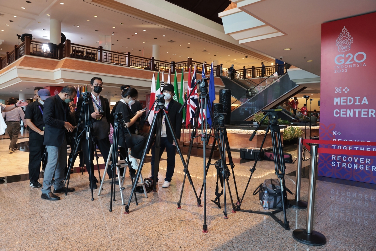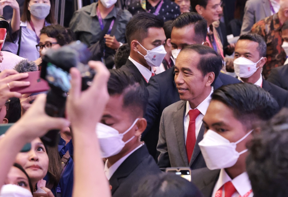 印度尼西亞總統佐科在媒體中心舉行的記者會結束後,被熱情的媒體層層包圍合影。