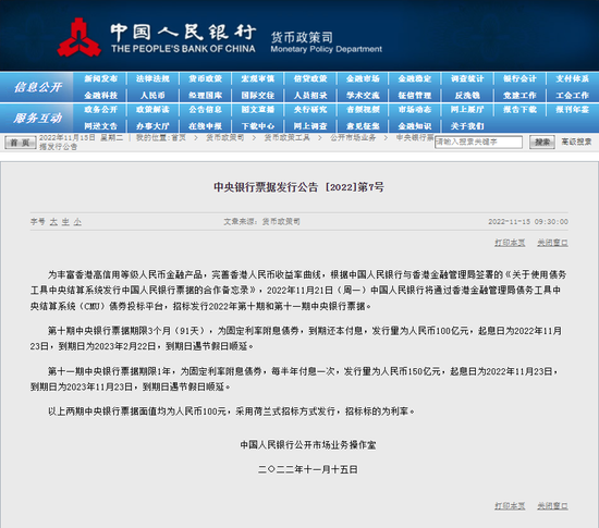 香港新聞網11月16日電 央行將於11月21日在香港發行3個月期100億元和1年期150億元人民幣央票,采用荷蘭式招標方式發行,招標標的為利率。 據央行網站公告的消息,為豐富香港高信用等級人民幣金融產品,完善香港人民幣收益率曲線,根據中國人民銀行與香港金融管理局簽署的《關於使用債務工具中央結算系統發行中國人民銀行票據的合作備忘錄》,2022年11月21日(周一)中國人民銀行將通過香港金融管理局債務工具中央結算系統(CMU)債券投標平台,招標發行2022年第十期和第十一期中央銀行票據。