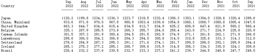 香港新聞網11月18日電 美國國債遭遇了一輪慘烈的拋售潮。美國財政部昨(17日)公佈了2022年9月的國際資本流動報告(TIC)。報告顯示,全球投資者持有的美國國債總規模從8月份的7.509萬億美元降至了9月份7.296萬億美元,為2021年5月以來的最低水平,單月拋售達2130億美元(約合港幣16673億元)。 根據美國財政部公佈的2022年9月的國際資本流動報告(TIC)顯示,截至今年9月末,外國投資者持有的美國國債規模已下降至2021年5月以來的最低水平。從全球投資者的持倉數據來看,外國投資者持有的美國國債總規模從8月份的7.509萬億美元降至了9月份7.296萬億美元,為2021年5月以來的最低水平,單月拋售超2130億美元(約合人民幣15502億元)。 持有美國國債規模前十的國家和地區中,僅有英國、比利時在9月選擇了增持,其餘8個國家和地區全部選擇拋售。其中,美國兩大“債主”日本、中國的減持力度,尤為凶猛。