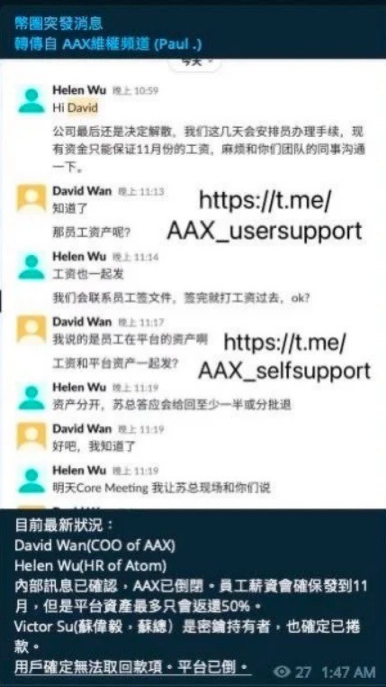 AAX於13日以系統升級發生異常為由,暫停用戶提款服務,並表示會在7至10日內恢復,但至今未成事。 此前的11月13日,AAX交易所聲稱暫停是由於第三方服務供應商系統昇級期間出現技術錯誤,與FTX倒閉無關,13日AAX在網絡上發表一份聲明表示:“鑒於我們業界第二大平台FTX上周破產,加密貨幣用戶當然會擔心中心化數位資產交易所的運營和財務穩定性。”并聲稱,“在AAX,我們始終將用戶放在第一位,在這裡我們想與您分享以下有關我們當前情況的更新。我們希望作為一個社區,我們能够一起勇敢地度過這些困難時期。” 當時, AAX 也聲稱它遭受多次惡意攻擊,并限制提款等服務,因為技術團隊必須手動校對,并將系統恢複到涵蓋所有用戶的最大準確性。AAX的聲明還保證說,AAX所有數位資產都完好無損,大量存儲在冷錢包中,用戶資金永遠不會面臨任何融資或風險活動的交易對手風險。 沒想到逾2周後,還是出事了。副總裁Ben Castlin在11月28日下午於個人推特上表示已從 AAX離職。他說自己曾經為社群努力爭取,但沒有任何一項被公司接受;AAX交易所目前已不存在,品牌信任已蕩然無存,但他仍稱希望事態最終不會走到惡意倒閉的方式來處理。 28日AAX 維權頻道的消息傳來,該交易所合夥人、密鑰持有者蘇偉毅(Victor Su)“確定卷款潛逃”,“用戶確定無法取回款項”。(完) 【編輯:錢林霞】