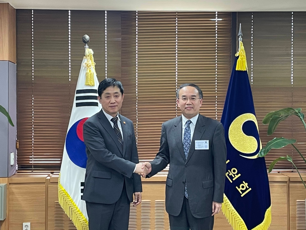 圖片來源:政府新聞網。圖示許正宇(右)與韓國金融委員會委員長金周顯(左)會面。 許正宇亦會見了韓國經營者總協會副會長李東根,他說,香港歡迎來自海外的企業和人才,並已成立專責團隊,有策略地招商引才。