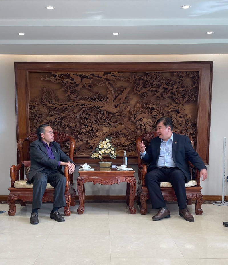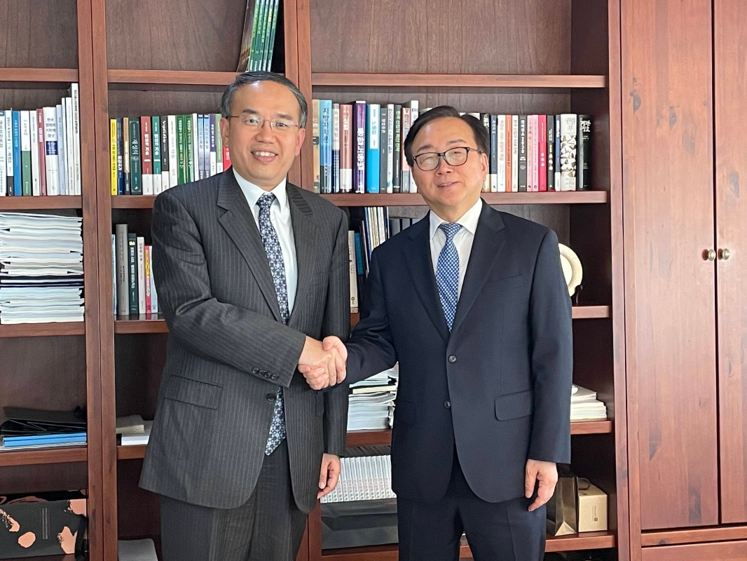 圖片來源:政府新聞網。圖示許正宇(左)與韓國經營者總協會副會長李東根(右)會面。 3日,許正宇禮節性拜會中國駐韓國大使邢海明。許正宇表示,財經事務及庫務局採取 “引進來 ”和“走出去”的策略,推動香港金融市場的發展,他亦向韓國金融業和商界人士介紹香港在“一國兩制 ”下的獨特優勢。