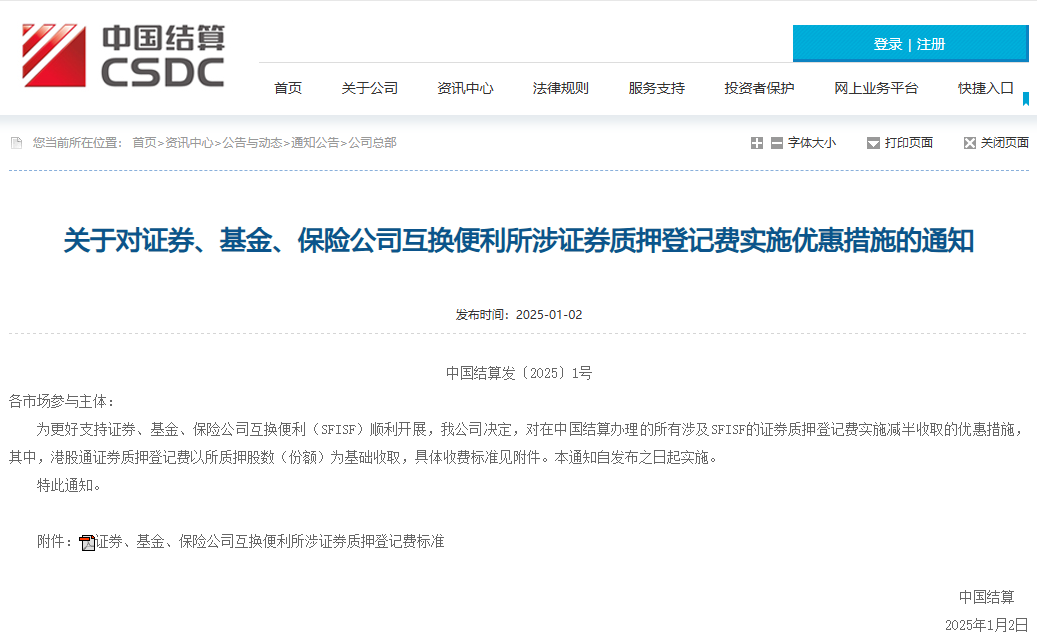 香港新聞網1月2日電 1月2日,中國結算發布通知並施行,為更好支持證券、基金、保險公司互換便利(SFISF)順利開展,決定對在中國結算辦理的所有涉及SFISF的證券質押登記費實施減半收取的優惠措施。