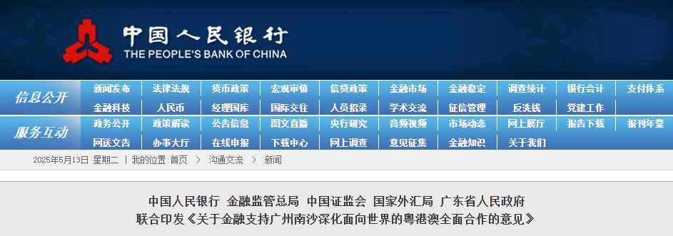 香港中通社5月12日電 中國人民銀行、金融監管總局、中國證監會、國家外滙局及廣東省人民政府12日聯合印發《關於金融支持廣州南沙深化面向世界的粵港澳全面合作的意見》,為加強社會民生領域金融服務、發展特色金融服務、推進粵港澳金融市場互聯互通及完善金融監管機制等方面提出30條重點舉措,推動廣州南沙在粵港澳大灣區新發展格局戰略支點。
