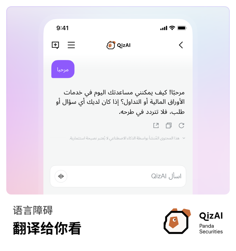 從過往的投資實操經歷看,參與跨境交易往往面臨語言障礙、文化差異及交易流程不熟悉等挑戰,這些問題不僅增加了交易成本,也在一定程度上限制了全球資本市場的流動性,成為很多海外投資者的困擾。QizAI從設計之初便精准洞察這些痛點,以多語言服務能力為核心,致力於打造一款真正符合海外客戶需求的產品。目前,QizAI已支持簡體中文、繁體中文、英文和阿拉伯語等多種語言交互,並針對不同地區客戶的語言習慣優化界面設計。未來,該產品還將持續擴展語言種類,覆蓋更廣泛的海外市場,進一步降低全球投資者的參與門檻。 在交互方式上,QizAI突破了傳統證券軟件的複雜佈局,採用智能對話模式,使操作更加直觀高效。客戶無需在繁復的菜單中尋找功能入口,只需通過自然語言輸入需求,QizAI便能迅速理解意圖,並提供實時市場數據或交易建議。這種“對話即交易”的創新模式,尤其適合對廣大海外投資者,幫助他們更輕鬆地參與全球資本市場。