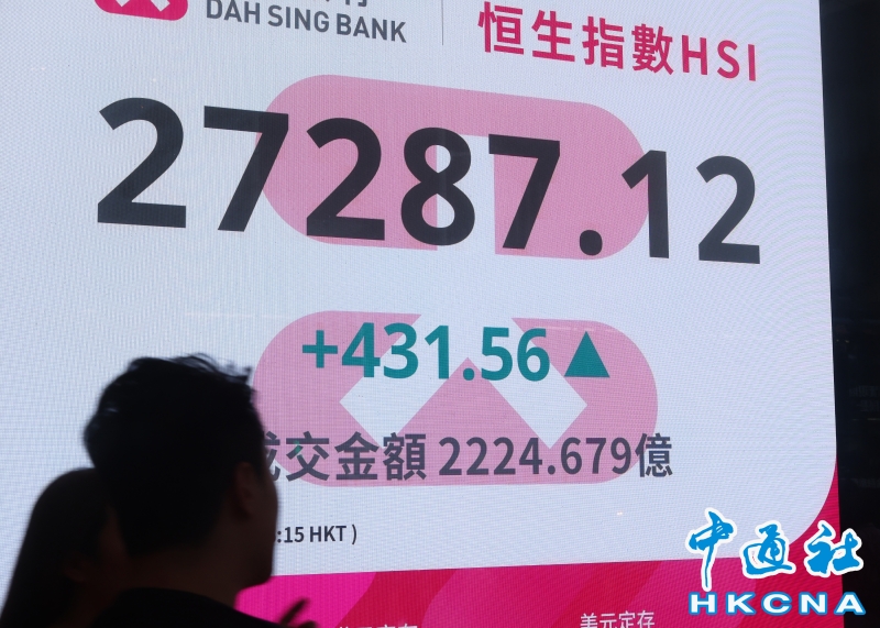 •   10月2日,香港恒生指數漲431.56點,漲幅1.61%,報27287.12點,主板全天成交2224.68億港元。(香港中通社鄧梓傑 攝) 香港中通社圖片