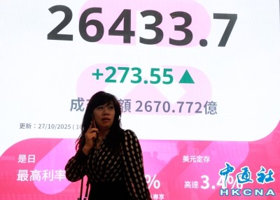 香港中通社10月27日電(記者 徐嘉儀)中美就貿易等議題形成初步共識,加上A股走強,港股27日進一步向上推進,恆生指數收市報26433點,升273點。大市成交額為2670億港元。