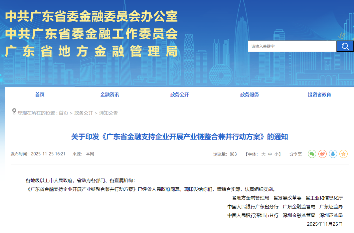 圖源:廣東省委金融委員會辦公室網站截圖 11月25日,廣東省地方金融管理局、廣東省發展改革委、廣東省工業和資訊化廳等部門聯合印發《廣東省金融支持企業開展產業鏈整合兼併行動方案》。 方案提出規範開展跨境整合兼併,積極探索聯合港澳資本設立跨境整合兼併基金,優化合格境外有限合夥人(QFLP)和合格境內有限合夥人(QDLP)試點機制,支持港澳金融機構參與內地產業鏈整合兼併項目。支援企業在港澳發行離岸人民幣債券融資,開展產業鏈整合兼併。 拓寬資本市場直接融資管道方面,鼓勵各地完善企業上市綜合服務平台,健全梯度培育機制,支援突破關鍵核心技術的科技型等企業到創業板、科創板等上市,支持其他符合條件的企業積極上市融資,支持港股上市的粵港澳大灣區企業在深圳證券交易所上市,拓寬企業融資管道。(完) 【編輯:彭玉婷】