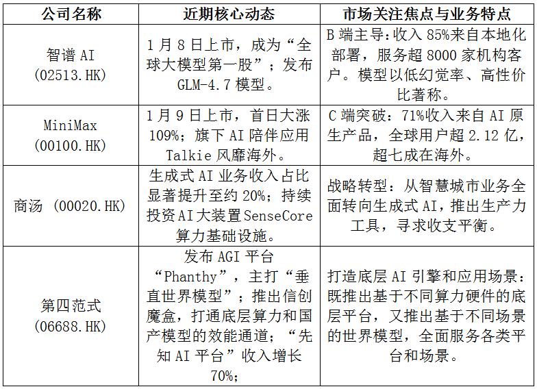 盡管同屬AI板塊,但這些公司正走出差異化的商業化路徑: 智譜與MiniMax代表了“B端服務”與“C端應用”的路線分野。智譜深耕企業級市場,通過為金山辦公、蒙牛等大客戶提供定製化部署獲得穩定收入;而MiniMax則憑借Talkie/星野等應用,在海外情感陪伴市場取得爆發性增長,其收入高度依賴用戶規模與持續付費。 商湯與第四範式則體現了老牌AI巨頭與垂直領域專家的不同轉型姿態。商湯正艱難而決絕地剝離傳統業務,將未來押註於生成式AI及其所需的龐大算力基礎;第四範式則始終聚焦企業服務,其新發布的“垂直世界模型”路徑,旨在通過深度結合行業知識,解決通用模型在專業領域的應用難題,這與近期“人工智能+製造”的政策導向高度契合。 市場展望:從估值狂歡到價值檢驗 當前港股AI板塊的整體性上漲,是由政策預期、資本事件和產品突破共同催化的結果。然而,市場在給予整體熱情的同時,也正對不同技術路徑和商業模式的真實價值進行更細致的甄別。智譜AI和MiniMax的IPO成功,分別驗證了市場對頂尖大模型技術能力和現象級C端應用的高度追捧,其估值邏輯側重於長期的增長敘事與市場份額。商湯的上漲與其向生成式AI的戰略轉型決心及算力卡位密切相關;第四範式本輪連續放量上漲,是市場對於其打造底層平臺同時對接各類垂直場景的戰略布局高度認可的體現。 上市和產品發布只是起點,港股AI板塊的這輪升溫,最終需要各公司用持續的營收增長、清晰的盈利路徑和穩固的競爭壁壘來兌現。板塊行情能否從“政策與產品雙輪驅動”進階至“應用場景和經營業績雙支撐”,將是下一階段的核心觀察點。 (完) 【編輯:張明臻】