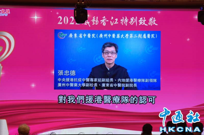 11月18日,香港大公文匯傳媒集團舉行“慶祝香港回歸祖國 25 周年——2022感動香江頒獎典禮”。今年,香港大公文匯傳媒集團策劃舉辦“慶祝香港回歸祖國 25 周年—— 2022感動香江評選活動”,最終評選出5個“2022感動香江團體”、7個“2022感動香江人物”及1個“2022感動香江特別致敬”獎項。圖為內地援港醫療隊獲頒發“2022感動香江特別致敬”獎項。(香港中通社記者 許其皓攝) 香港中通社圖片