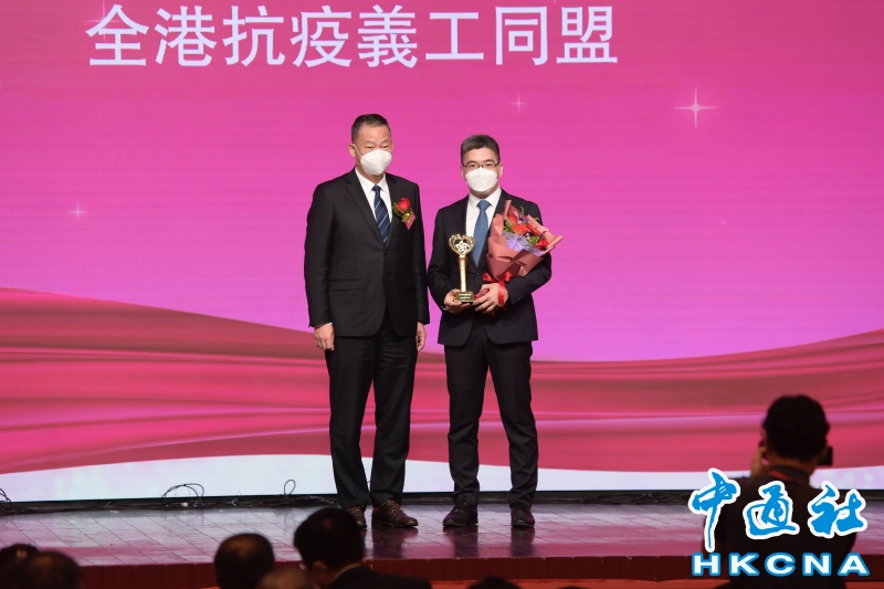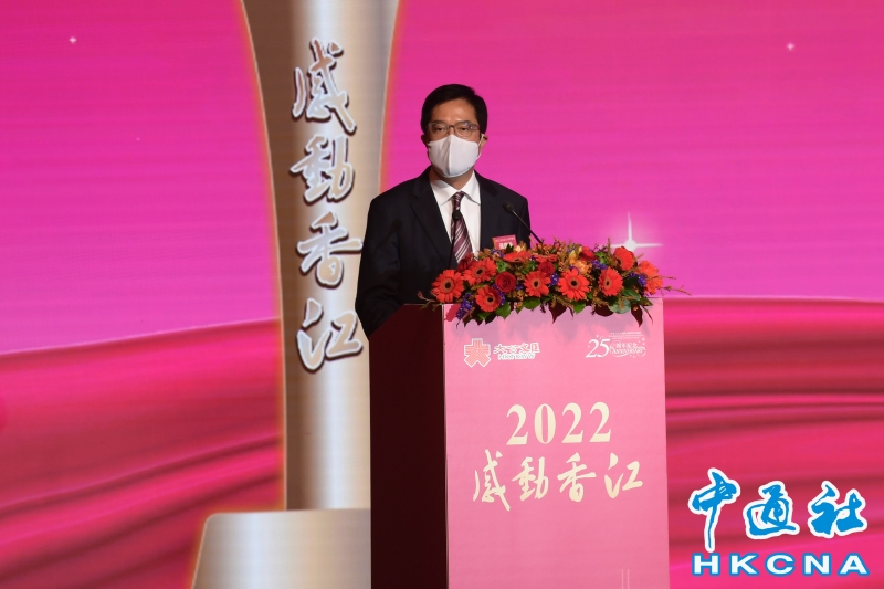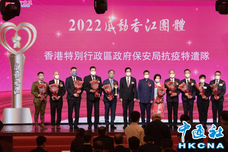 11月18日,香港大公文匯傳媒集團舉行“慶祝香港回歸祖國 25 周年——2022感動香江頒獎典禮”。今年,香港大公文匯傳媒集團策劃舉辦“慶祝香港回歸祖國 25 周年—— 2022感動香江評選活動”,最終評選出5個“2022感動香江團體”、7個“2022感動香江人物”及1個“2022感動香江特別致敬”獎項。圖為中央人民政府驻香港特别行政区维护国家安全公署局长鄧建偉(左)為全港抗疫義工同盟頒發“2022感動香江團體”獎項。(香港中通社記者 許其皓攝) 香港中通社圖片