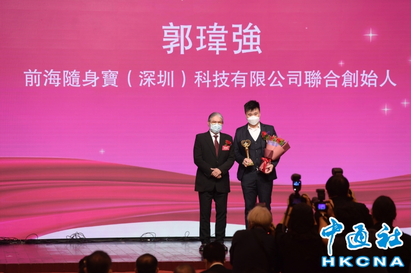 11月18日,香港大公文匯傳媒集團舉行“慶祝香港回歸祖國 25 周年——2022感動香江頒獎典禮”。今年,香港大公文匯傳媒集團策劃舉辦“慶祝香港回歸祖國 25 周年—— 2022感動香江評選活動”,最終評選出5個“2022感動香江團體”、7個“2022感動香江人物”及1個“2022感動香江特別致敬”獎項。圖為中國香港體育協會暨奧林匹克委員會會長霍震霆(左)為前海隨身寶(深圳)科技有限公司聯合創始人郭瑋強頒發“2022感動香江人物”獎項。(香港中通社記者 許其皓攝) 香港中通社圖片
