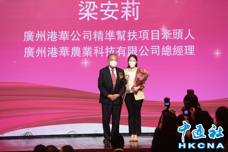 11月18日,香港大公文匯傳媒集團舉行“慶祝香港回歸祖國 25 周年——2022感動香江頒獎典禮”。今年,香港大公文匯傳媒集團策劃舉辦“慶祝香港回歸祖國 25 周年—— 2022感動香江評選活動”,最終評選出5個“2022感動香江團體”、7個“2022感動香江人物”及1個“2022感動香江特別致敬”獎項。圖為全國政協常委周安達源(左)為廣州港華公司精準幫扶項目牽頭人梁安莉頒發“2022感動香江人物”獎項。(香港中通社記者 許其皓攝) 香港中通社圖片