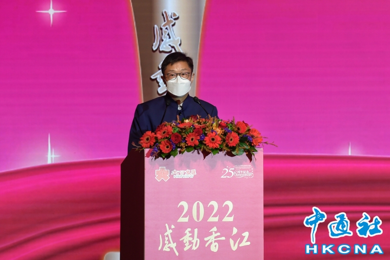 11月18日,香港大公文匯傳媒集團舉行“慶祝香港回歸祖國 25 周年——2022感動香江頒獎典禮”。今年,香港大公文匯傳媒集團策劃舉辦“慶祝香港回歸祖國 25 周年—— 2022感動香江評選活動”,最終評選出5個“2022感動香江團體”、7個“2022感動香江人物”及1個“2022感動香江特別致敬”獎項。圖為香港特區政府財政司副司長黃偉綸致辭。(香港中通社記者 許其皓攝) 香港中通社圖片