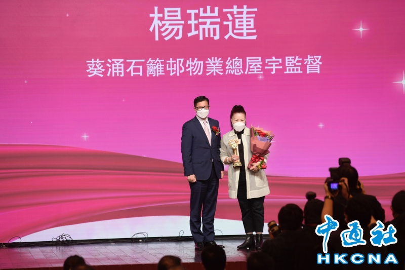 11月18日,香港大公文匯傳媒集團舉行“慶祝香港回歸祖國 25 周年——2022感動香江頒獎典禮”。今年,香港大公文匯傳媒集團策劃舉辦“慶祝香港回歸祖國 25 周年—— 2022感動香江評選活動”,最終評選出5個“2022感動香江團體”、7個“2022感動香江人物”及1個“2022感動香江特別致敬”獎項。圖為香港特區政府保安局局長鄧炳強(左)為葵涌石籬邨物業總屋宇監督楊瑞蓮頒發“2022感動香江人物”獎項。(香港中通社記者 許其皓攝) 香港中通社圖片