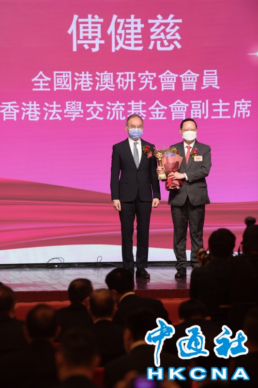 11月18日,香港大公文匯傳媒集團舉行“慶祝香港回歸祖國 25 周年——2022感動香江頒獎典禮”。今年,香港大公文匯傳媒集團策劃舉辦“慶祝香港回歸祖國 25 周年—— 2022感動香江評選活動”,最終評選出5個“2022感動香江團體”、7個“2022感動香江人物”及1個“2022感動香江特別致敬”獎項。圖為香港特區政府政制及內地事務局局長曾國衛(左)為全國港澳研究會會員傅健慈頒發“2022感動香江人物”獎項。(香港中通社記者 許其皓攝) 香港中通社圖片