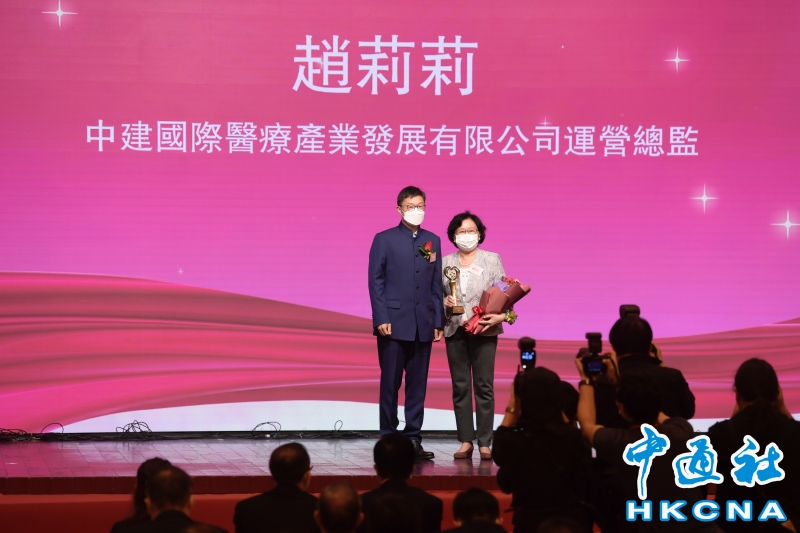 11月18日,香港大公文匯傳媒集團舉行“慶祝香港回歸祖國 25 周年——2022感動香江頒獎典禮”。今年,香港大公文匯傳媒集團策劃舉辦“慶祝香港回歸祖國 25 周年—— 2022感動香江評選活動”,最終評選出5個“2022感動香江團體”、7個“2022感動香江人物”及1個“2022感動香江特別致敬”獎項。圖為香港大公文匯傳媒集團副董事長王凱波(左)為中建國際醫療產業發展有限公司運營總監趙莉莉頒發“2022感動香江人物”獎項。(香港中通社記者 許其皓攝) 香港中通社圖片