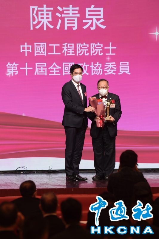 11月18日,香港大公文匯傳媒集團舉行“慶祝香港回歸祖國 25 周年——2022感動香江頒獎典禮”。今年,香港大公文匯傳媒集團策劃舉辦“慶祝香港回歸祖國 25 周年—— 2022感動香江評選活動”,最終評選出5個“2022感動香江團體”、7個“2022感動香江人物”及1個“2022感動香江特別致敬”獎項。圖為香港特區政府財政司副司長黃偉綸(左)為中國工程院院士陳清泉頒發“2022感動香江人物”獎項。(香港中通社記者 許其皓攝) 香港中通社圖片