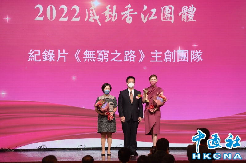 11月18日,香港大公文匯傳媒集團舉行“慶祝香港回歸祖國 25 周年——2022感動香江頒獎典禮”。今年,香港大公文匯傳媒集團策劃舉辦“慶祝香港回歸祖國 25 周年—— 2022感動香江評選活動”,最終評選出5個“2022感動香江團體”、7個“2022感動香江人物”及1個“2022感動香江特別致敬”獎項。圖為外交部駐港特派員公署新聞及公共關係部主任黃景睿(中)為紀錄片《無窮之路》主創團隊頒發“2022感動香江團體”獎項。(香港中通社記者 許其皓攝) 香港中通社圖片