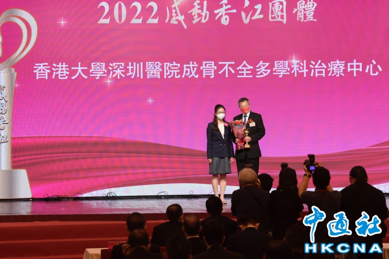 11月18日,香港大公文匯傳媒集團舉行“慶祝香港回歸祖國 25 周年——2022感動香江頒獎典禮”。今年,香港大公文匯傳媒集團策劃舉辦“慶祝香港回歸祖國 25 周年—— 2022感動香江評選活動”,最終評選出5個“2022感動香江團體”、7個“2022感動香江人物”及1個“2022感動香江特別致敬”獎項。圖為香港中聯辦青年工作部副部長萬寧(左)為香港大學深圳醫院成骨不全多學科治療中心頒發“2022感動香江團體”獎項。(香港中通社記者 許其皓攝) 香港中通社圖片