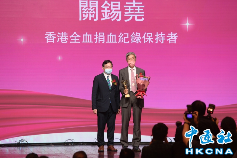 11月18日,香港大公文匯傳媒集團舉行“慶祝香港回歸祖國 25 周年——2022感動香江頒獎典禮”。今年,香港大公文匯傳媒集團策劃舉辦“慶祝香港回歸祖國 25 周年—— 2022感動香江評選活動”,最終評選出5個“2022感動香江團體”、7個“2022感動香江人物”及1個“2022感動香江特別致敬”獎項。圖為香港特區政府運輸及物流局局長林世雄(左)為香港全血捐血紀錄保持者關錫堯頒發“2022感動香江人物”獎項。(香港中通社記者 許其皓攝) 香港中通社圖片
