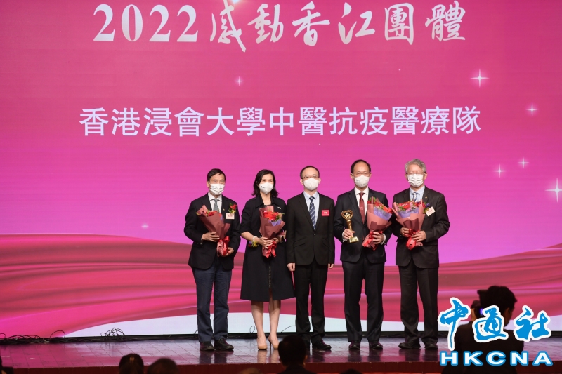 11月18日,香港大公文匯傳媒集團舉行“慶祝香港回歸祖國 25 周年——2022感動香江頒獎典禮”。今年,香港大公文匯傳媒集團策劃舉辦“慶祝香港回歸祖國 25 周年—— 2022感動香江評選活動”,最終評選出5個“2022感動香江團體”、7個“2022感動香江人物”及1個“2022感動香江特別致敬”獎項。圖為香港中聯辦宣傳文體部副部長林枬(中)為香港浸會大學中醫抗疫醫療隊頒發“2022感動香江團體”獎項。(香港中通社記者 許其皓攝) 香港中通社圖片