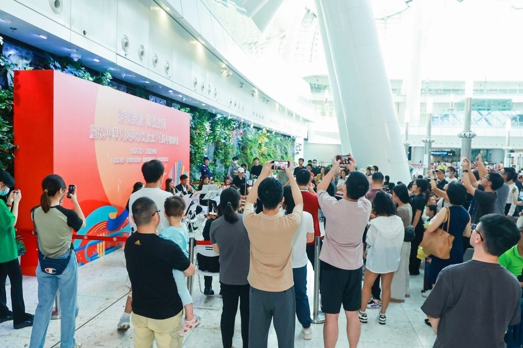 香港新聞網10月5日電 10月5日下午,17位藝術家們為乘客們上演了一場小型交響樂演奏會,當《我和我的祖國》音樂奏響香港西九龍高鐵站候車大廳時,現場觀眾在17位大灣區樂手的演奏聲中齊聲高唱這首膾炙人口的歌曲,將現場氛圍推向高潮。