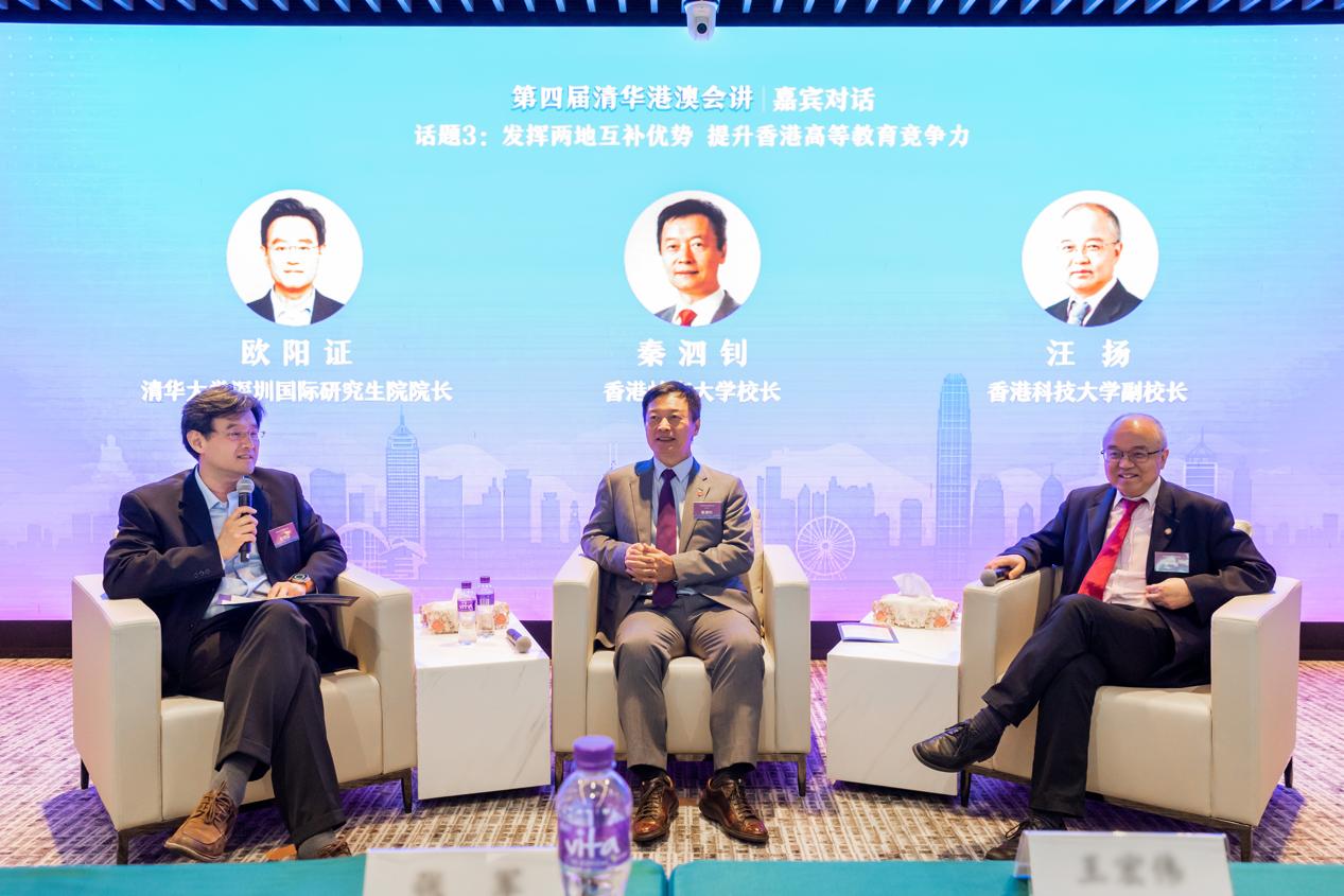第二組嘉賓對話 第三組對話圍繞“發揮兩地互補優勢 提升香港高等教育競爭”的話題展開探討。清華大學深圳國際研究生院院長歐陽證(兼主持),香港嶺南大學校長秦泗釗,香港科技大學副校長汪揚參與對話。從培養工科人才的意義、香港人才培養和高等教育的獨特之處以及如何與內地人才培養形成優勢互補、香港培養工科人才的具體實現方式與路徑等方面問題展開交流。