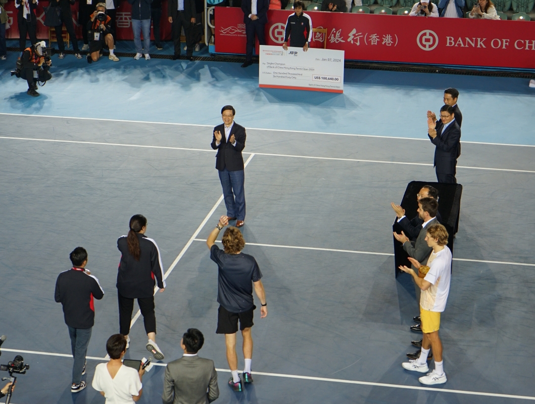 香港中通社圖片(殷田靜子攝) 李家超說,比賽不單是獲頒授“M”品牌認可的世界級體育賽事,更是暌違21年後再次在香港舉辦的ATP男子職業網球巡迴賽,意義非凡。決賽期間球場內外氣氛熾熱,他和在場觀眾一樣看得非常投入,並一同為球員精彩的表現歡呼喝彩。 【編輯:陈卓仪】