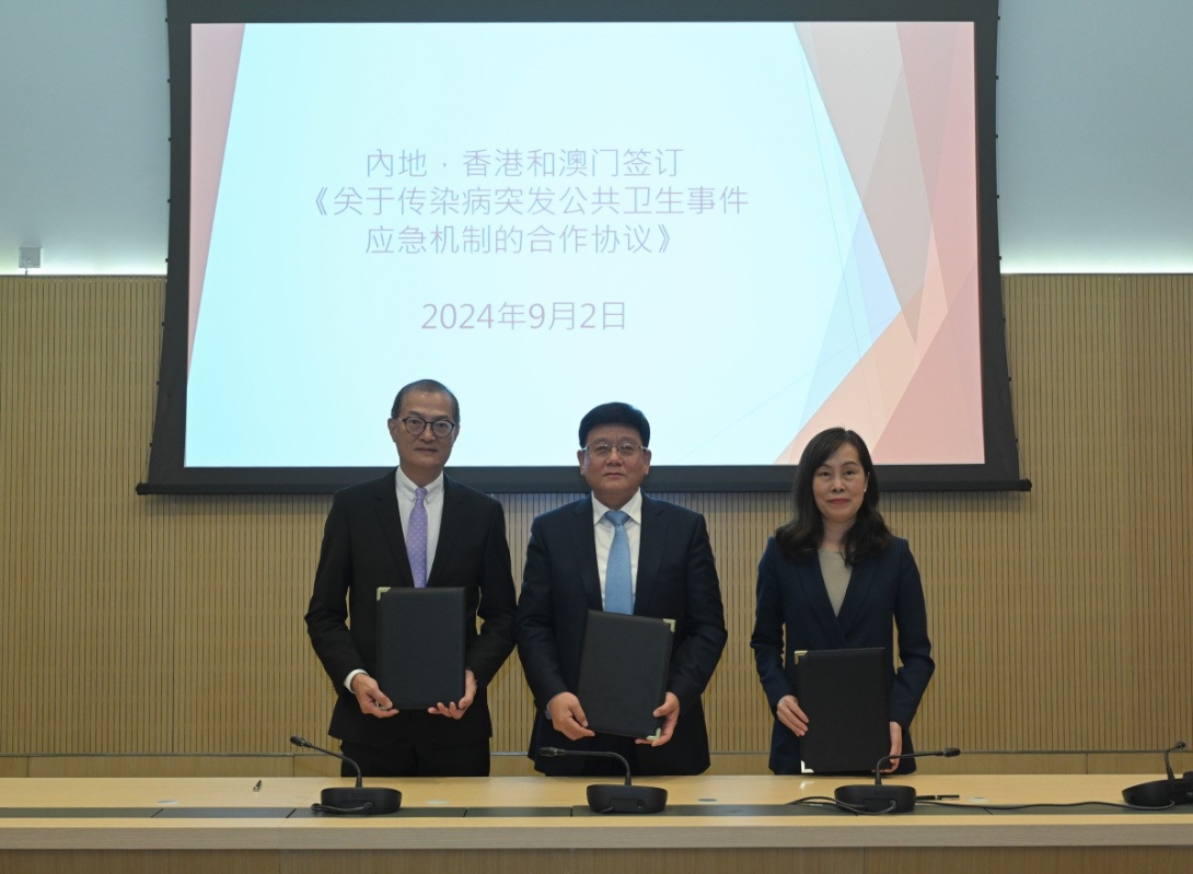 香港特區與內地和澳門特區簽署《關於傳染病突發公共衞生事件應急機制的合作協議》。圖自政府新聞處 根據合作協議,內地、香港特區和澳門特區的合作和交流範圍包括傳染病和群體性不明原因傳染病方面的疫情信息通報、應急處置的協調聯動、傳染病突發公共衞生事件應急的技術、培訓及科研等。 盧寵茂表示,在制訂與傳染病突發公共衞生事件相關的應變策略和防控措施時,衞生機構之間的協作尤為重要。香港特區政府一直十分重視與國家疾控局、澳門特區政府社會文化司司長辦公室保持緊密合作,以在應對重大傳染病爆發流行時,切實保障各地民眾的健康和生命安全,維護社會穩定和確保經濟持續發展。(完) 【編輯:梅婉潼】