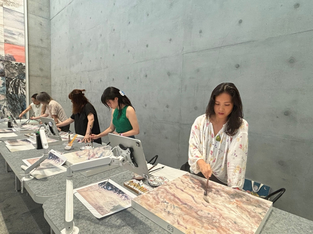 藝術家及學生現場協力繪製《江山如此多嬌》。(香港中通社記者 黃璇攝) 為呼應本次特展,戴光郁策劃的參與式裝置《如此江山》亦於6月14日至8月10日在M+焦點空間展出,逾200位藝術家及學生協作重繪傅抱石與廣東畫家關山月的經典巨作《江山如此多嬌》,與觀眾一同見證二十世紀廣東藝術的全國性崛起。(完) 【編輯:黃璇】