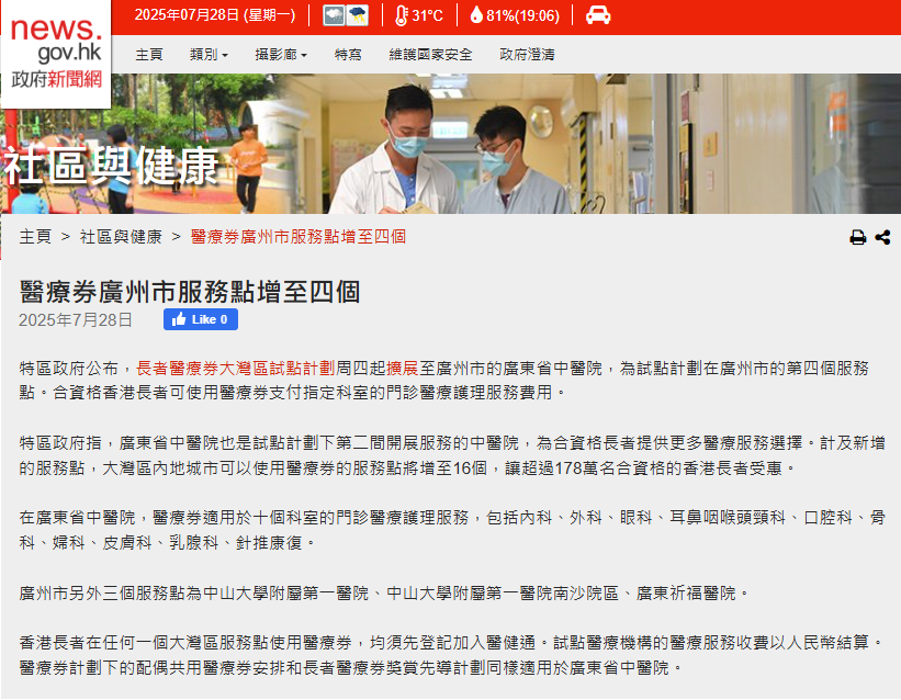 圖源:政府新聞網截圖 政府發言人表示,廣東省中醫院是“長者醫療券大灣區試點計劃”下廣州市內第四個服務點,亦是第二間開展服務的中醫院,為合資格長者提供更多醫療服務選擇。 除廣東省中醫院外,廣州市另外三個服務點為中山大學附屬第一醫院、中山大學附屬第一醫院南沙院區,及廣東祈福醫院。 在廣東省中醫院,醫療券將適用於其10個指定科室的門診醫療護理服務,包括內科、外科、眼科、耳鼻咽喉頭頸科、口腔科、骨科、婦科、皮膚科、乳腺科及針推康復。 試點醫療機構的醫療服務收費以人民幣結算,醫療機構會為長者申報使用醫療券,並按醫療券計劃下每月更新的換算率計算需扣除的港元醫療券金額。醫療機構會於收費處標示計劃下每月的指明換算率,供長者參考。(完) 【編輯:彭玉婷】