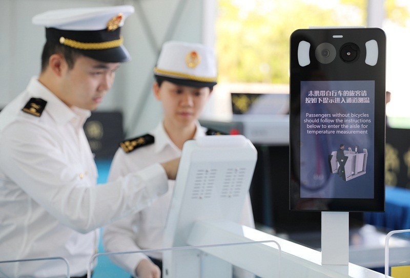 為迎接自行車公路賽男子個人賽,拱北海關關員對體溫檢測閘機進行測試。(圖源:中國海關總署)