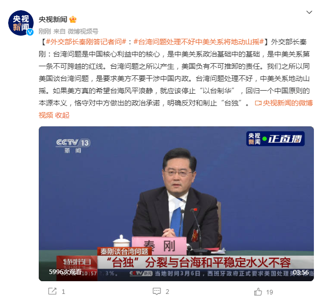 全國兩會 | 秦剛:台灣問題處理不好,中美關係將地動山搖