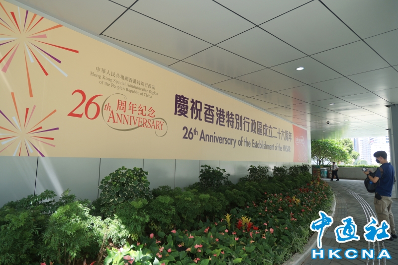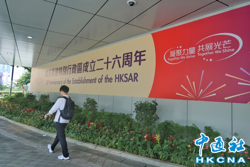 •   近期,香港特區政府總部外張貼巨幅海報,慶祝香港回歸祖國26周年。(香港中通社記者 許其皓攝) 香港中通社圖片