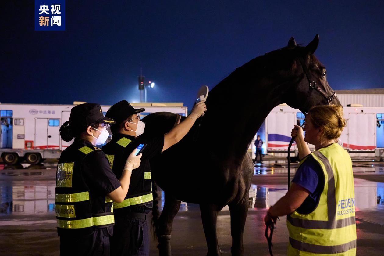 圖源:央視新聞客戶端(下同) 杭州亞運會賽事總指揮部馬術項目管理指揮中心相關負責人表示,“這些參賽馬經過了十幾個小時的長途飛行,狀態比較疲憊,我們要在精準查驗、確保安全的同時,盡可能縮短通關轉運時間,保障馬匹福利。”為此,杭州蕭山國際機場停機坪提前用圍擋設置了專門的馬匹裝卸轉運場地,完成場地消殺,專用運輸車輛和設備提前進入。海關就近設置隨機人員通關專用通道,縮短人、馬分離時間,保障隨機人員與參賽馬同步通關,并創新開發參賽馬芯片識別程序,運用“賽馬檢疫在線”智慧監管系統大幅提升參賽馬身份驗核效率。同時,通過優化流程、協同運行,確保馬匹裝備、飼料、獸藥、馬醫療器械等隨機物資快速通關。參賽馬采用“快進快出”的方式,在同等動物衛生條件下參賽,比賽結束後立即出境,實現賽馬“順利入境、健康參賽、安全返回”。