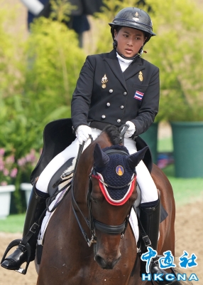 香港新聞網9月26日電 杭州亞運會馬術比賽9月26日在桐廬馬術中心開賽,當日舉行盛裝舞步聖喬治科目團體決賽及個人賽資格賽。泰國公主希里婉瓦麗作為泰國國家馬術隊的一員,參加馬術盛裝舞步比賽。