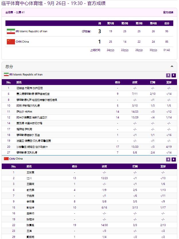 比賽中,在中國男排拿下第一局後,實力強勁的伊朗隊逐漸掌握比賽走勢,并最終完成逆轉。