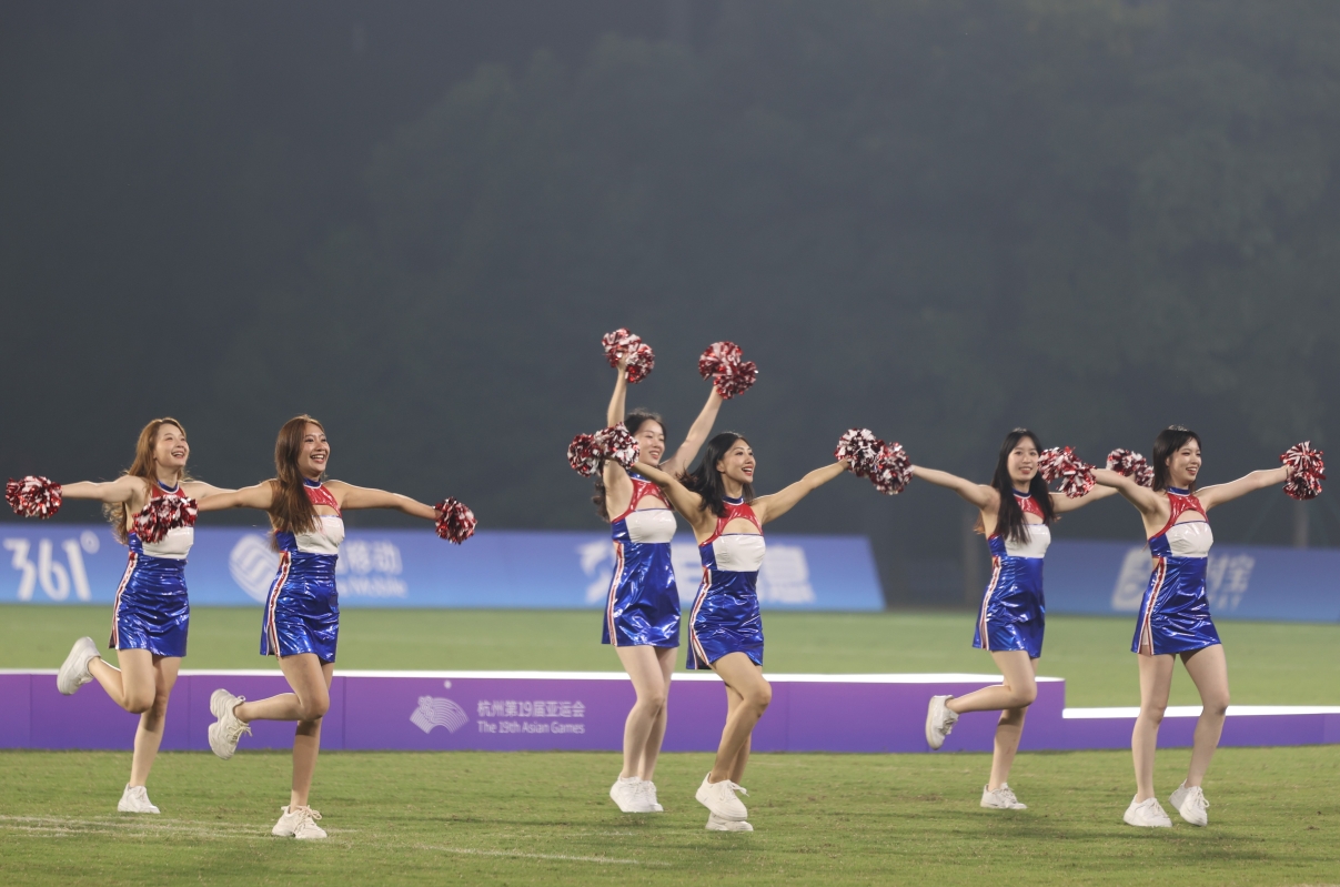 香港新聞網9月27日電(記者洪少葵)杭州19屆亞運會正在如火如荼進行,賽場上體育健兒奮力拼搏,場外為賽事加油打氣的女子啦啦隊,載歌載舞,熱情奔放,給各場競技項目帶來靚麗風景線。 9月26日,女子啦啦隊在七人制橄欖球賽場上為選手加油打氣。七人制橄欖球的比賽時間總長度14分鐘,上下半場各7分鐘,賽程緊凑,女子拉拉隊主要負責比賽前後的間歇表演,另外球員進場的時候她們也會在兩邊列隊歡呼。