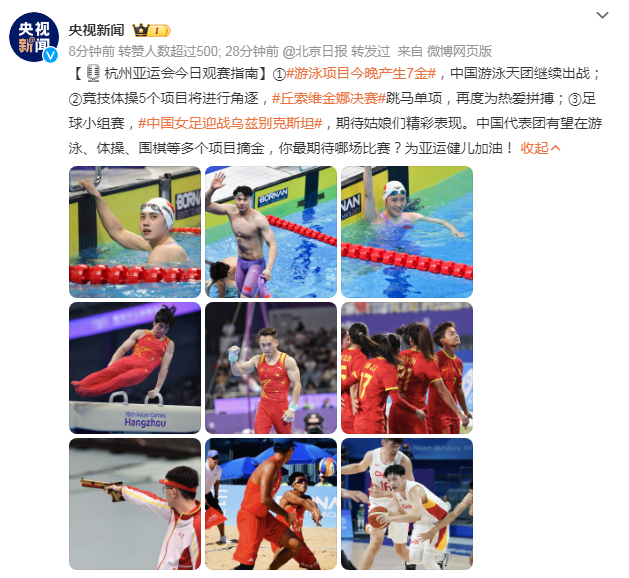 香港新聞網9月28日電 據央視新聞微博報道,①游泳項目今晚產生7金,中國游泳天團繼續出戰;②競技體操5個項目將進行角逐,丘索維金娜決賽跳馬單項,再度為熱愛拼搏;③足球小組賽,中國女足迎戰烏茲別克斯坦,期待姑娘們精彩表現。中國代表團有望在游泳、體操、圍棋等多個項目摘金,你最期待哪場比賽?為亞運健兒加油!