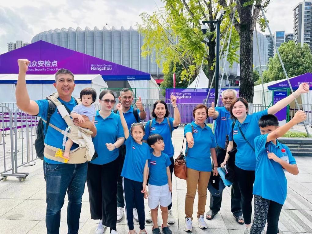 巴尼巴·翁巴達那吉的“親友團”(杭州市臨安區融媒體中心供圖) 據新華社報道,9月25日,在臨安區舉行的跆拳道比賽第二天,奧運積分排名第一的翁巴達那吉即將在女子49公斤級決賽中對陣中國選手郭清,翁巴達那吉的“親友團”卻正為比賽門票的事在場館售票點附近焦急徘徊。 “我和爸爸每一次都會陪她一起比賽,亞運會我們更是整個家族12個人一起來為她加油,爸爸、哥哥、嬸嬸……還有一個小寶寶。”翁巴達那吉的姐姐說,雖然他們一到達臨安就來買票,但實在沒想到亞運會的門票太搶手,根本買不到。 工作人員注意到焦急的泰國“親友團”,瞭解了他們的困難後,通過臨安區融媒體中心向市民“廣而告之”。短短兩個小時內,就有11位熱心的臨安人民將自己的跆拳道比賽門票轉贈給了翁巴達那吉的家人們。