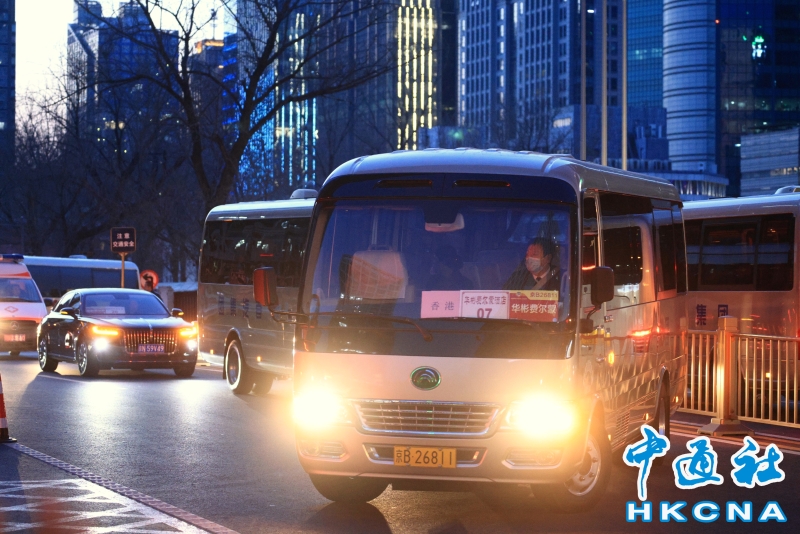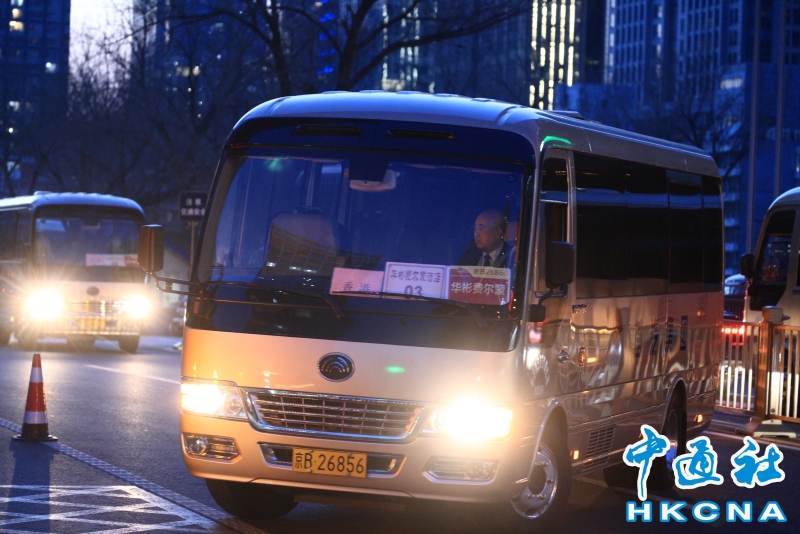 •   3月3日,港區全國政協委員陸續抵達北京。圖為接載部分港區全國政協委員的車隊抵達下榻酒店。(香港中通社記者 許其皓攝) 香港中通社圖片