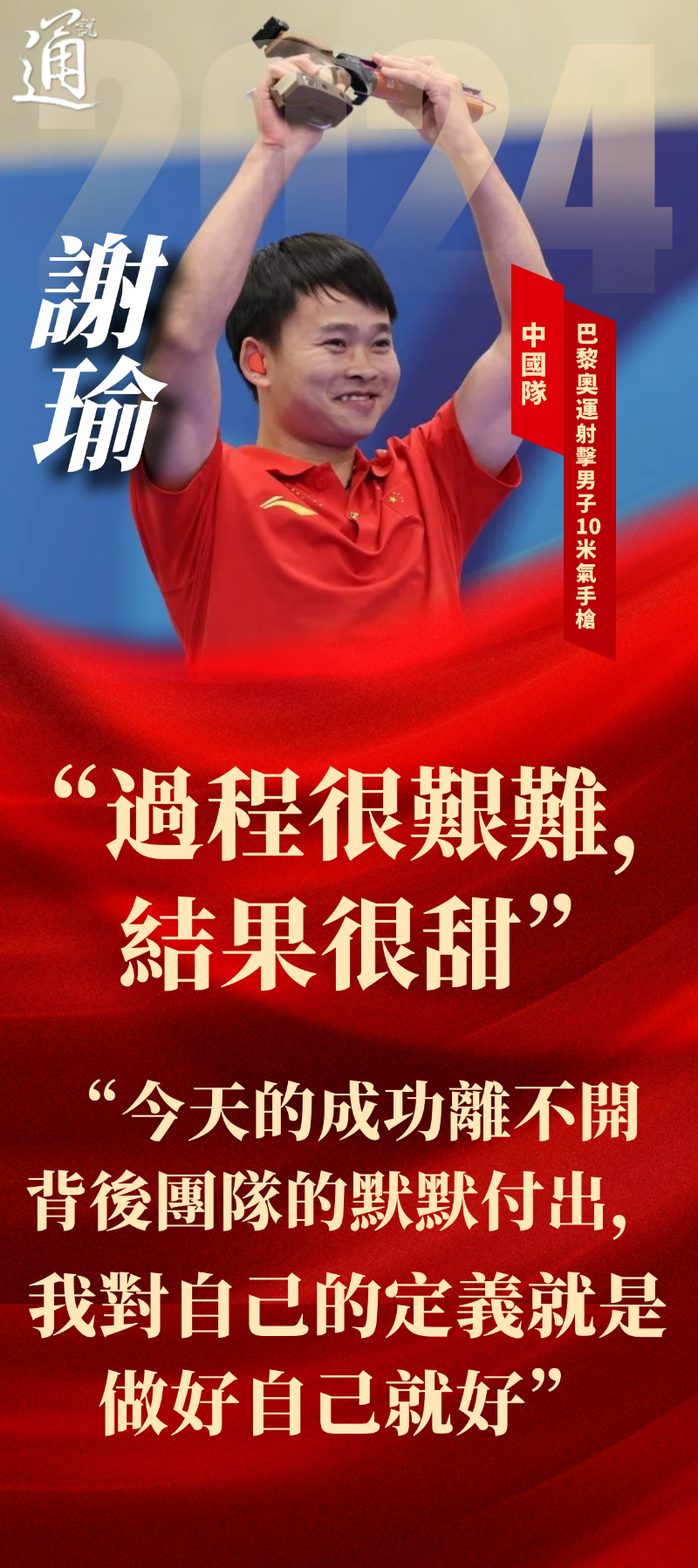 香港中通社7月29日電 當地時間28日,巴黎奧運會第二個比賽日,中國代表團射落第三金,日本隊亦迎來3枚金牌的豐收。賽場上,奧運冠軍們奮勇拼搏,在榮譽、鮮花與掌聲的背後,他們還留下許多經典話語,在時光的河流中熠熠閃光。 在28日進行的射擊男子10米氣手槍比賽中,中國選手謝瑜後來居上,以240.9環的成績為中國隊摘得本屆奧運第三金。賽後接受採訪時,謝瑜直言“過程很艱難,結果很甜。” 當日決賽,謝瑜10槍後排名第3。此後他的狀態一直很穩定,而領先的兩名意大利選手馬爾蒂尼和蒙納則出現失誤。最後一槍前,謝瑜領先馬爾蒂尼0.4環。最終馬爾蒂尼又打出9.5環,謝瑜則打出10.0環,摘得奧運桂冠。