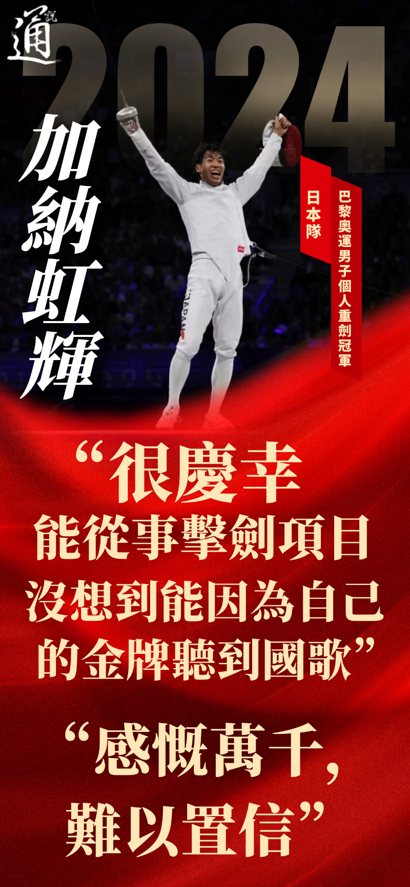(香港新聞網製圖) 日本隊的好運還延續到了擊劍男子個人重劍決賽,日本選手加納虹輝15:9擊敗法國選手博雷爾,為日本隊摘得歷史首枚奧運會男重個人金牌。 “很慶幸能從事擊劍項目。沒想到能因為自己的金牌聽到國歌。”沉浸於奪金喜悅的加納虹輝坦言“感慨萬千,難以置信”。