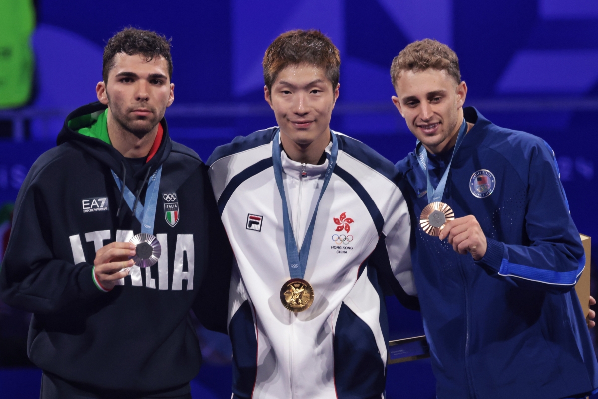 張家朗(中)衛冕奪得擊劍男子個人花劍金牌